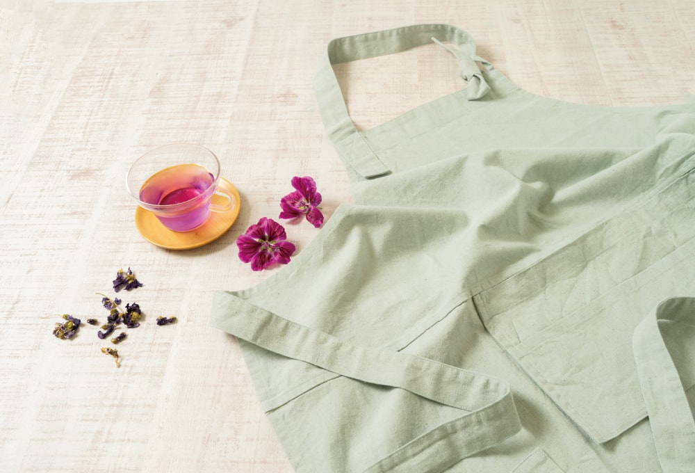 生活の木商品本部の機械選別と手選別による厳しいチェックの中で、ハーブティーの基準を満たせなかった素材(残渣・ざんさ)であるマロウブルーを染料の原料として利活用し、染色して縫製しています。