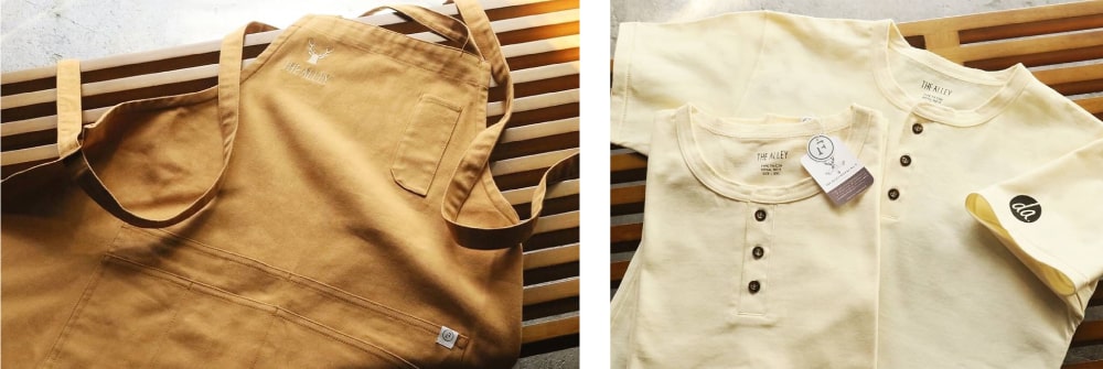 スタッフの作業性からポケットの数や⼨法など、THE ALLEYだけのオリジナル仕様のエプロン。