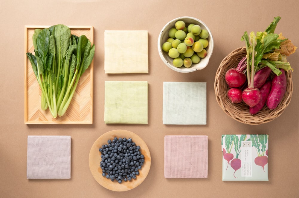 花ふきんを染め上げる際に使用した紫いも、うめの実、ブルーベリーの残渣は、中川政七商店商店でも販売している「山本佐太郎商店」や「堀内果実園」のもの、小松菜は「ひらの農園」、赤かぶは「木曽町」のものです。