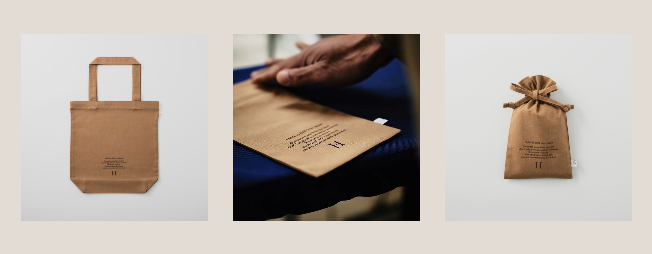 辻󠄀口博啓シェフがオーナーシェフを務めるフォルテシモ アッシュ様にて、カカオハスクで染めた巾着とトートバッグが発売されました。