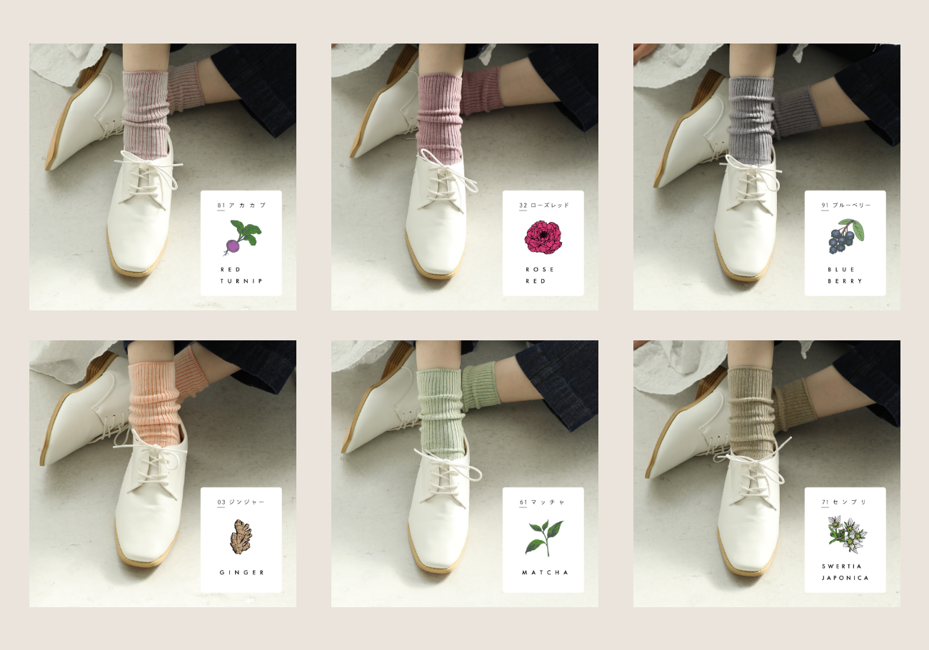 食品関連会社の廃棄予定食材から抽出した、環境にも人にも優しい染料で染色した商品で、今回は「ジンジャー」「ローズレッド」「抹茶」「センブリ」「赤カブ」「ブルーベリー」の6色展開。
