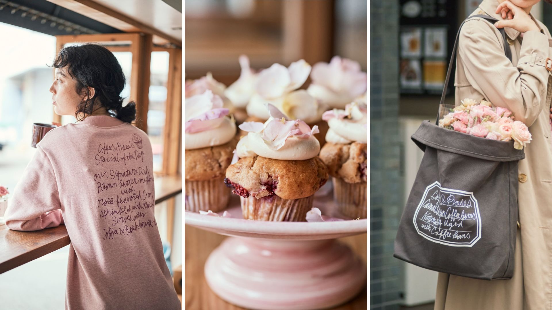 「COFFEE&ROSE」は架空のカフェ。もしこんなカフェがあったらきっとこんなアイテムを扱っているはずと、規格外品のバラの花びらで染めたトップスとコーヒーの出がらしで染めたバッグを作りました。