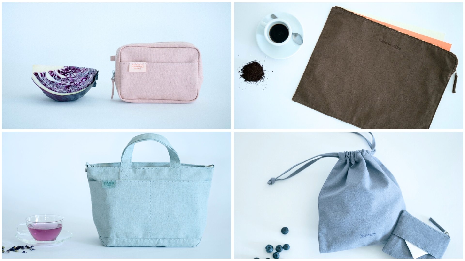 今回は、赤キャベツのピンク、ブルーベリーのライトパープル、ブルーマロウのミント、エスプレッソコーヒーのダークブラウンの全4色を使用しており、自然な色合いで手に取るたびに穏やかな気持ちにさせてくれるカラーとなっております。